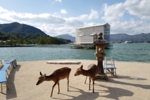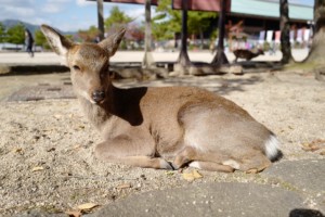 あの シカだらけで 鳥居が海の上にあって 神秘的な場所、干潮の時は歩いて鳥居まで行けるけど
